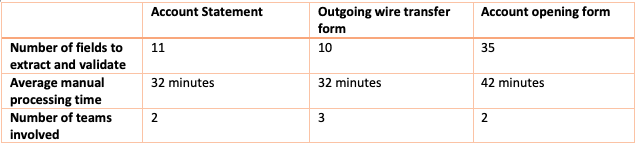 To complete the process successfully, you would need to extract data from a package of important documents with varying requirements and business logic that needs to be applied. For example, a standard package might include three or more documents, including account statements, wiring information, and account opening forms, all of which contain information that must be captured, transformed, and validated.
