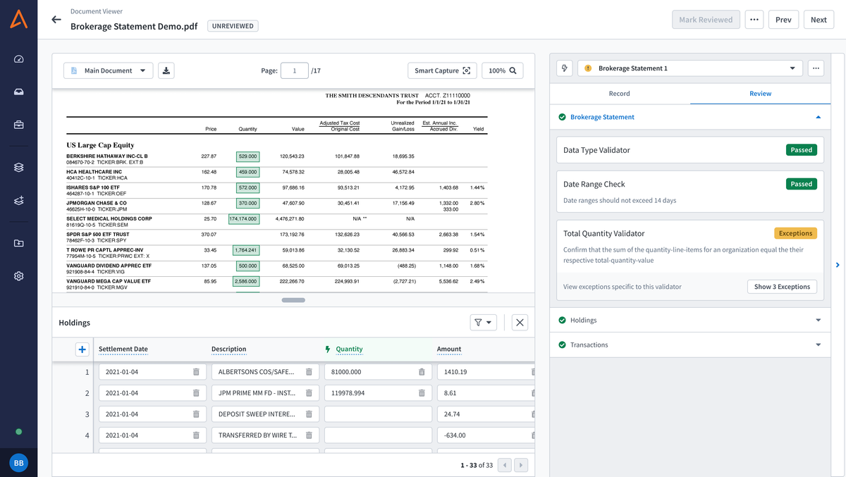 We’re taking it a step further with Advanced Validation, which lets you incorporate complex, logic- or math-based validations into your Patterns. You’ll be able to quickly and easily confirm if your document passes your Advanced Validation checks and instantly identify when and where the business logic of your extracted data doesn’t add up. Our new dedicated Review tab alongside each of your documents will show you exactly where and what data isn’t passing validation, and make it even easier to identify which areas of your document need a second look.