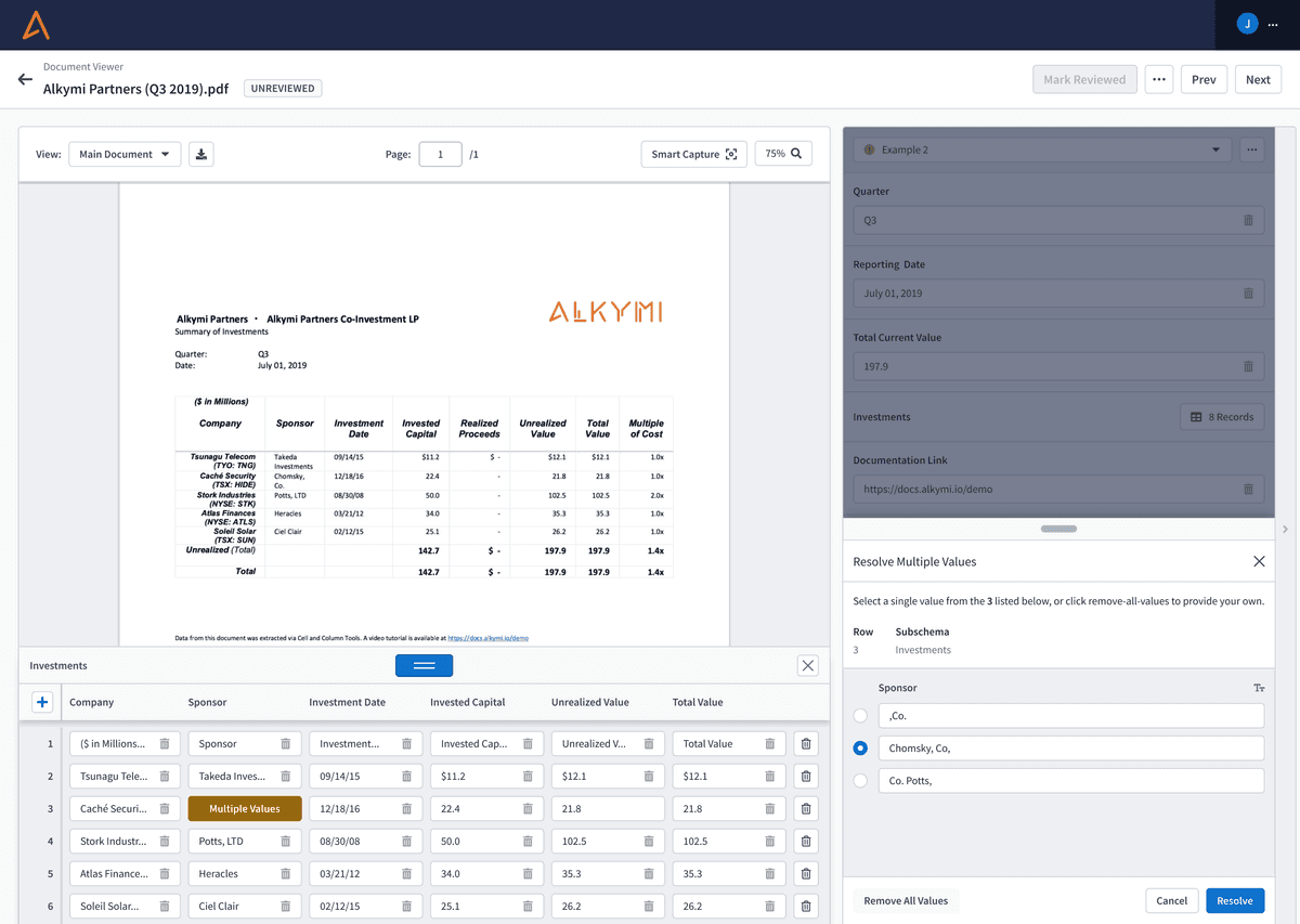 One of the bigger challenges in working with automated data extraction comes in identifying and correcting instances in which multiple potential values are associated with a single field. Sometimes a human operator is needed to break a tie between two good options. Surfacing and resolving these multi-hit data extractions could sometimes be time consuming.