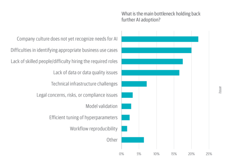 Over time, AI has consistently improved operational efficiencies by automating manual tasks that clutter daily workflows. Embedding AI into the enterprise, though, can be a wasted effort if you plan poorly. MIT Sloan Management Review confirms that 70% of businesses have seen little or no impact from AI so far. When you fail to get value from AI, you haven't landed on what problem to solve. An O'Reilly survey revealed one of the primary bottlenecks to AI adoption is the difficulty “in identifying appropriate business use cases."