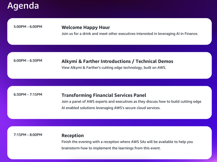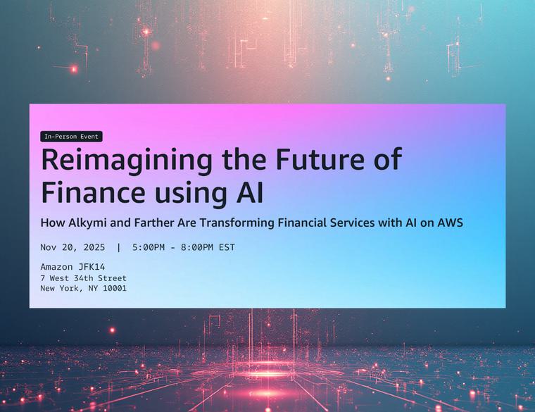 Discover how high-growth innovators like Alkymi and Farther are leveraging AWS's robust and secure cloud infrastructure to transform operations for financial firms and wealth management. Learn how each company is at the forefront of innovation within the financial services industry, utilizing AWS AI/ML services to: